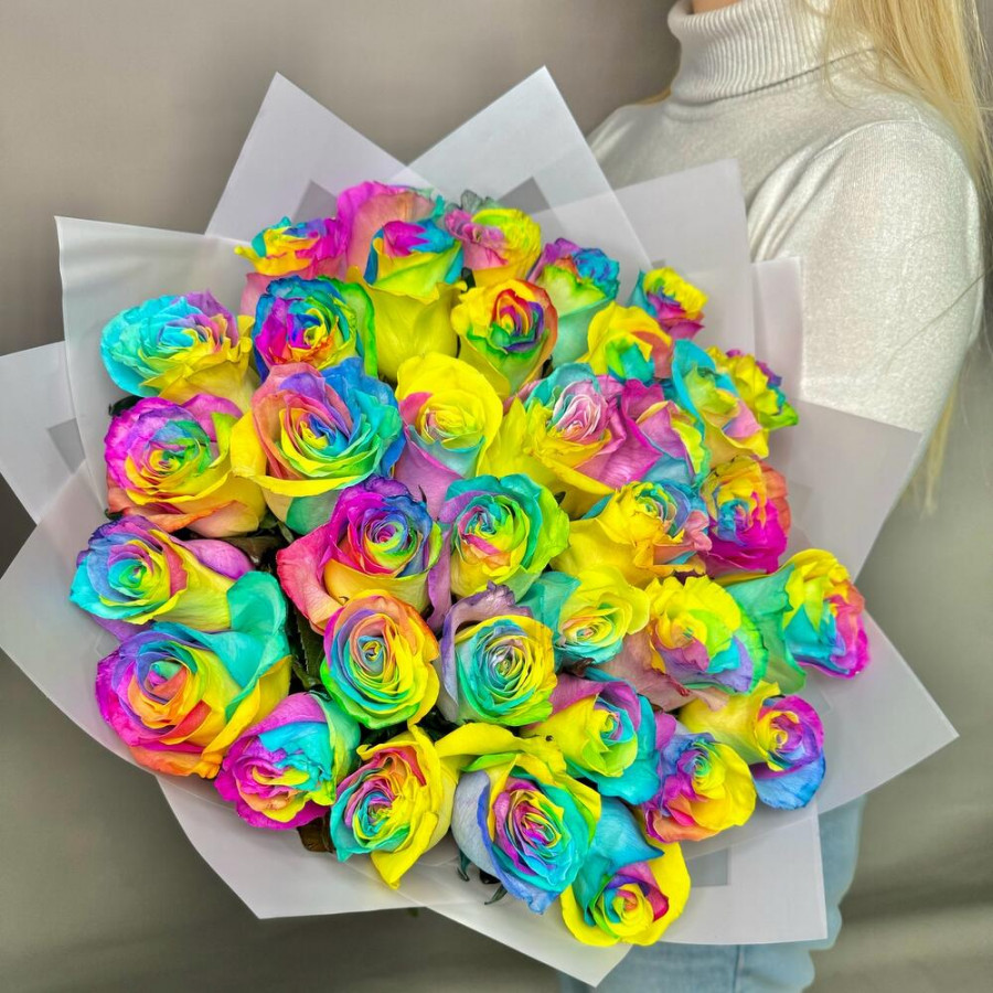 Радужная роза - 35 шт. Дизайнерская упаковка - 1 шт. бант атласный - 1 шт.