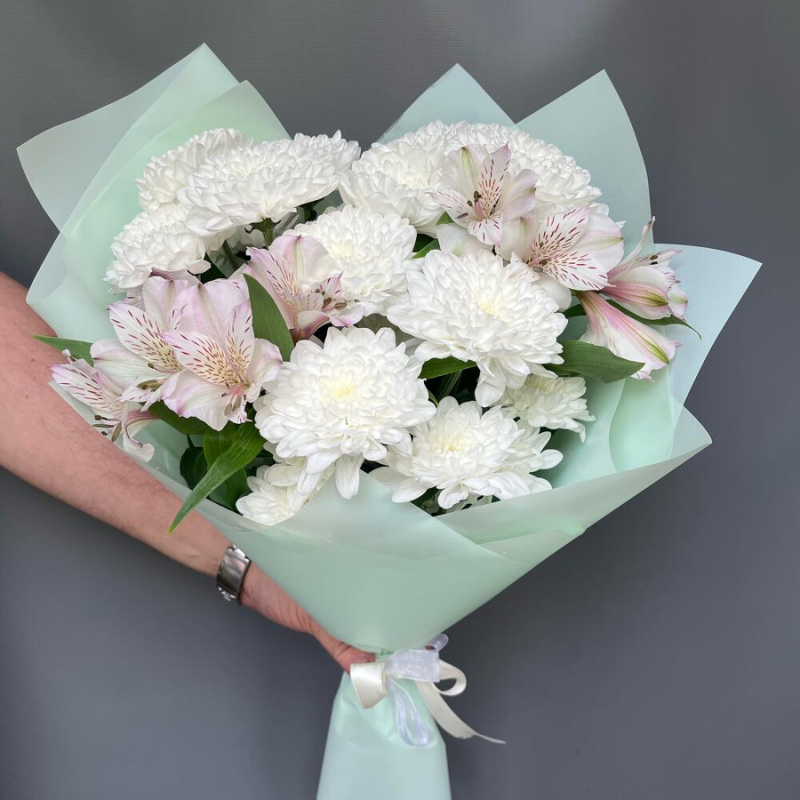На фото букет «белая акварель». В составе: альстромерия 2 шт, хризантема кустовая 3 шт, дизайнерская упаковка 1 шт, атласная лента 1 шт, . Все цветы свежие и ароматные, букет красиво оформлен и отлично подходит для подарка. Доступна доставка цветов или самовывоз.