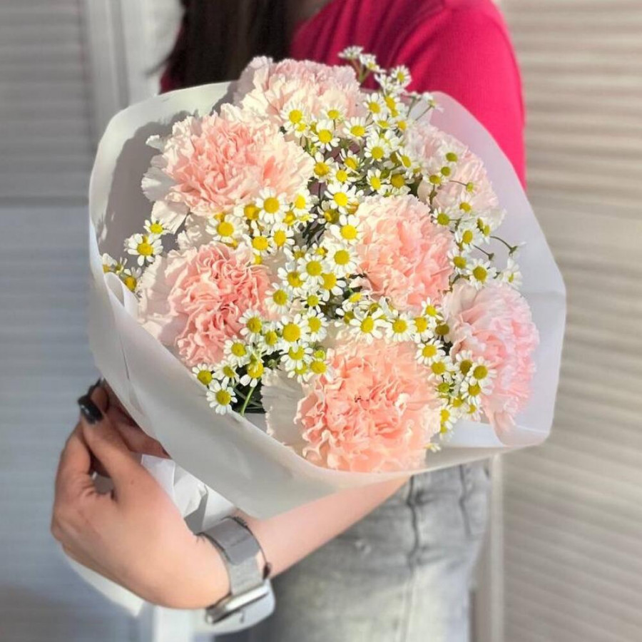 На фото букет «розовый пломбир». В составе: гвоздика 7 шт, танацетум 5 шт, дизайнерская упаковка 1 шт, атласная лента 1 шт, . Все цветы свежие и ароматные, букет красиво оформлен и отлично подходит для подарка. Доступна доставка цветов или самовывоз.